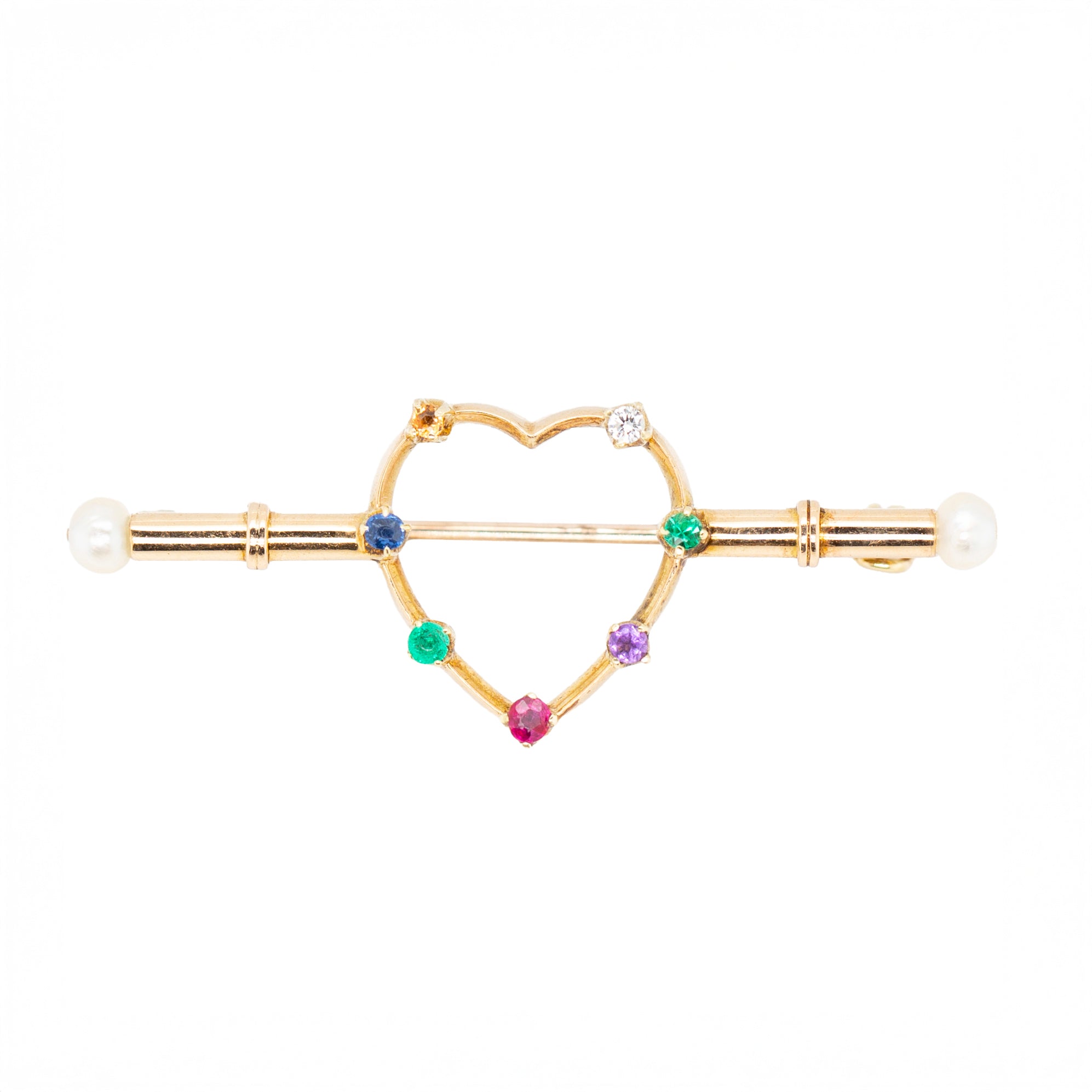 An acrostic 15ct gold heart brooch. The open heart is set with a sequence of gemstones spelling “DEAREST”: diamond, emerald, amethyst, ruby, emerald, sapphire, and topaz. The gems are claw-set in a heart-shaped frame. The bar design is accented by gold collars near each pearl. This brooch is a fine example of sentimental Victorian jewellery with a hidden romantic messaging in its gem-set code. Circa 1860–1870.