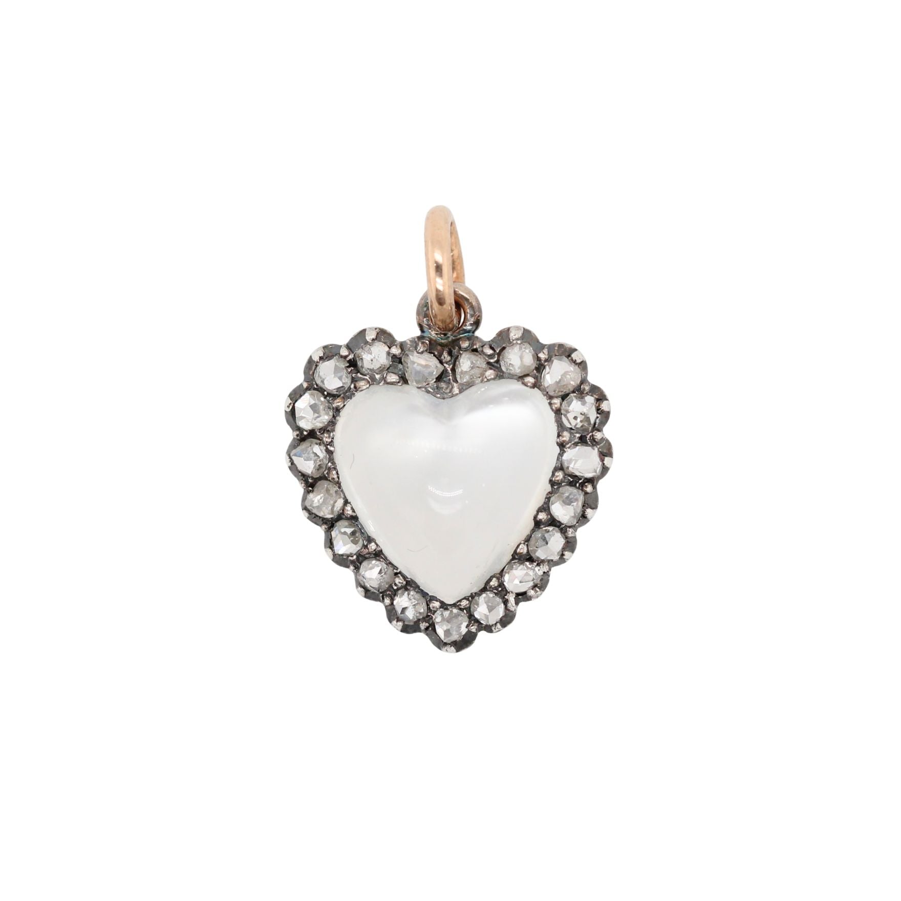 A charming moonstone and diamond heart pendant. With a central heart shaped moonstone surrounded by rose diamonds. Set in silver and 18ct gold. There are approximately 40 points of diamonds in total. Circa 1870.